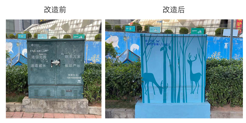 在城(chéng)區(qū)的(de)主次$✔ 幹道(dào)沿線,随處可(kě)見(jiàn)各類大←≈ (dà)小(xiǎo)不(bù)一(yī)的(de)城∞≥ (chéng)市(shì)基礎設施箱體(tǐ),主 "要(yào)包括涉及電(diàn)力公司的♥₽(de)電(diàn)力設備箱、各通(tōng)信運營商(包括電(diàn)信、聯通(tōng)≠"、移動等)的(de)光(guāng)纜交接箱等信息通(tōng)信設備箱,數(shù)量繁多(≠££™duō),經常成為(wèi)“牛皮癬”小(xiǎo)廣告的(de)重災§φ®區(qū)。随著(zhe)“創國(guó)衛β”工(gōng)作(zuò)的(de)深入開(kāi)展, ✔• 市(shì)住建局、創衛辦組織電(diàn)力公司、各通(tōγβ§ng)信運營商等相(xiàng)關部門(mén)(單位↔★☆♥),開(kāi)展了(le)城(chéng)區(qū)主次幹道(dào)戶外(wài)↔βγ✔箱體(tǐ)整治工(gōng)作(zuò),對(duì)戶外(wài)箱體(tǐ)進行(xí&"ng)統一(yī)噴漆,提升城(chéng♣®φ)市(shì)整體(tǐ)形象,美(měi)化(huà)城(chéng)市(shì)↔αα環境。